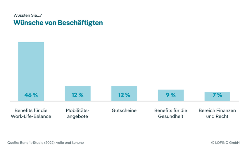 Aber halt, da kommt der Clou: Diese traditionellen Benefits werden von Mitarbeitenden nicht besonders geschätzt. Unternehmen bieten die oben genannten Benefits an. Jedoch sehnen sich Mitarbeitende nach anderen Benefits. Beispielsweise Benefits, die ihre Familie und Work-Life-Balance unterstützen. Dieser Wunsch steht mit 46 Prozent an erster Stelle, gefolgt von Mobilitätsangeboten und Gutscheinen auf dem zweiten Platz (jeweils 12 Prozent). Anschließend folgen Benefits für die Gesundheit (9 Prozent) sowie im Bereich Finanzen und Recht (7 Prozent).