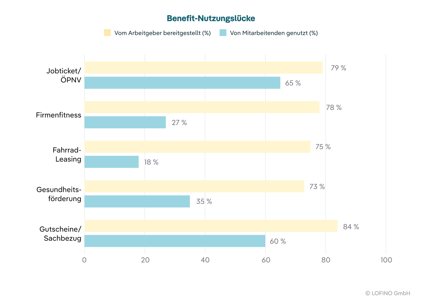Nur wenige Beschäftigte nutzen die vorhandenen Benefits. Nur 48% der deutschen Arbeitnehmenden nutzen ihre Mitarbeiter-Benefits regelmäßig, obwohl 86% Benefits von ihrem Arbeitgeber erhalten. Gleichzeitig messen nur 46% der Unternehmen überhaupt, welche Benefits genutzt werden.